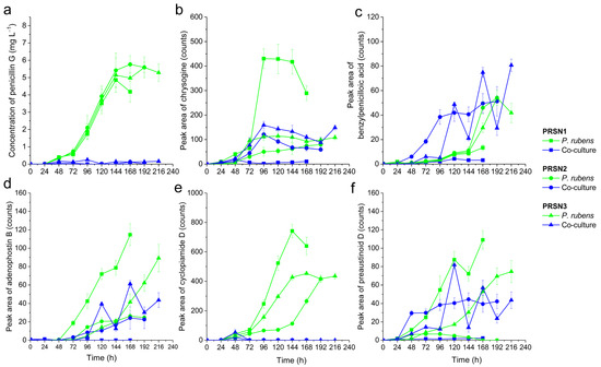 Time courses of secondary metabolite levels in the co-cultures of P. rubens and S. noursei and the corresponding monocultures of P. rubens. The production profiles of 6 metabolites originating from P. rubens are depicted, including penicillin G (a) and the putatively identified chrysogine (b), benzylpenicilloic acid (c), adenophostin B (d), cyclopiamide D (e), and preaustinoid D (f). Error bars represent ±standard deviation values calculated for experimental triplicates.