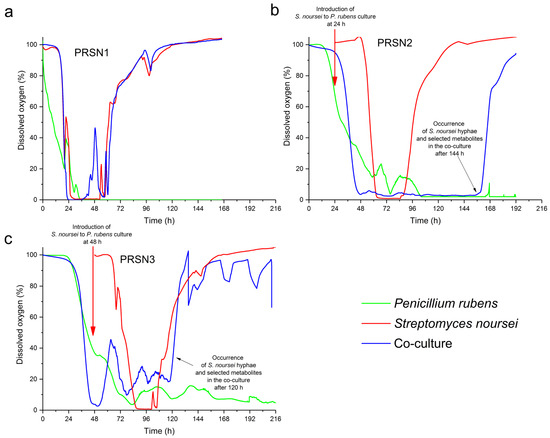 In the case of the DO curve in the PRSN3 co-culture (Figure 3c), the increase in DO concentration started earlier than in the PRSN2, i.e., already 120 h after P. rubens inoculation or, if the actinomycete inoculation is chosen as a reference time point, 72 h after S. noursei introduction into the bioreactor. It is important to note that the time interval ranging from S. noursei inoculation to the moment when the DO profiles reached an inflection point (and hereby started to rise towards 100%) varied markedly among the three investigated co-cultures. To be more specific, this period lasted for 60, 132, and 72 h in PRSN1, PRSN2, and PRSN3 co-cultures, respectively.