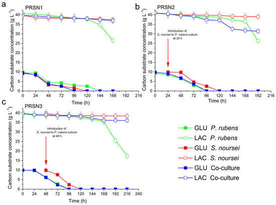 Glucose (GLU) and lactose (LAC) concentration values in the PRSN1 (a), PRSN2 (b), and PRSN3 (c) co-cultures of P. rubens and S. noursei and the corresponding monocultures. Error bars represent ±standard deviation values calculated for experimental triplicates.