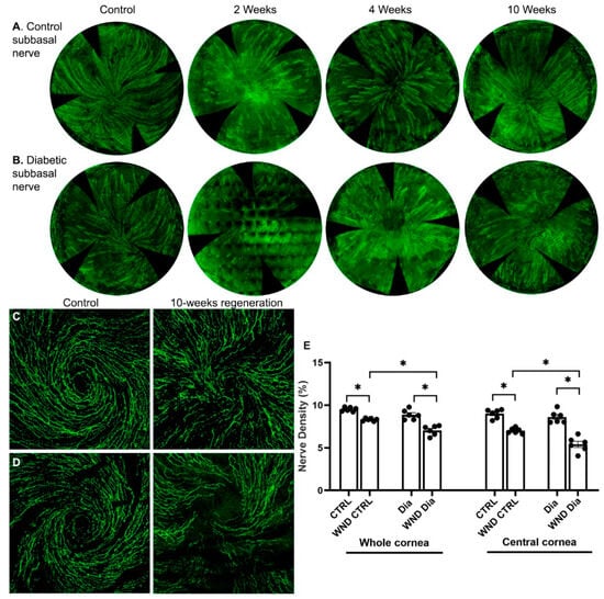 Sub-basal nerves were lost following epithelial cell and superficial stroma removal. After 2 weeks, clusters of regenerated sub-basal nerves were observed in wounded normoglycemic and diabetic corneas (Figure 1A,B). In normoglycemic mice at 4 weeks, the sub-basal nerves were more developed, and 10 weeks after wounding, a developing whorl-like pattern was observed (Figure 1C). In diabetic mice, the sub-basal intraepithelial nerves regenerated more slowly, and the whorl-like pattern was only partially developed (Figure 1B,D). Sub-basal nerve density over the whole cornea and separately in the central cornea was measured 10 weeks after wounding (Figure 1E). The WND CTRL whole cornea nerve density was significantly lower than CTRL (8.3 ± 0.16% vs. 9.5 ± 0.23%, p < 0.05), and the WND Dia corneas had a significantly lower density than the Dia corneas (7.0 ± 0.57% vs. 8.9 ± 0.58%, respectively). The WND Dia whole cornea nerve density was significantly lower than the WND CTRL density.