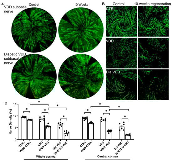 The cornea is one of the most densely innervated tissues in the human body, containing 19,000 to 44,000 small nerve fiber afferents. It exhibits a complex nerve architecture, distribution, and structural organization [1]. The outermost layer of the cornea consists of a stratified squamous, non-keratinized epithelium. Cornea nerve fibers originate from cell bodies residing in the trigeminal ganglion, losing their myelin as they enter the cornea and terminating on the superficial surface of the cornea between the basal epithelium and Bowman’s layer. In addition to their important sensory functions, corneal nerves help to maintain epithelial homeostasis, which is essential for the functional integrity of the ocular surface [2]. Loss of corneal nerves in diabetic corneas and following corneal wounding, particularly in diabetic corneas, can contribute to diabetic keratitis and poor wound healing.