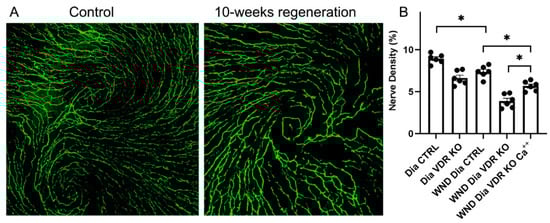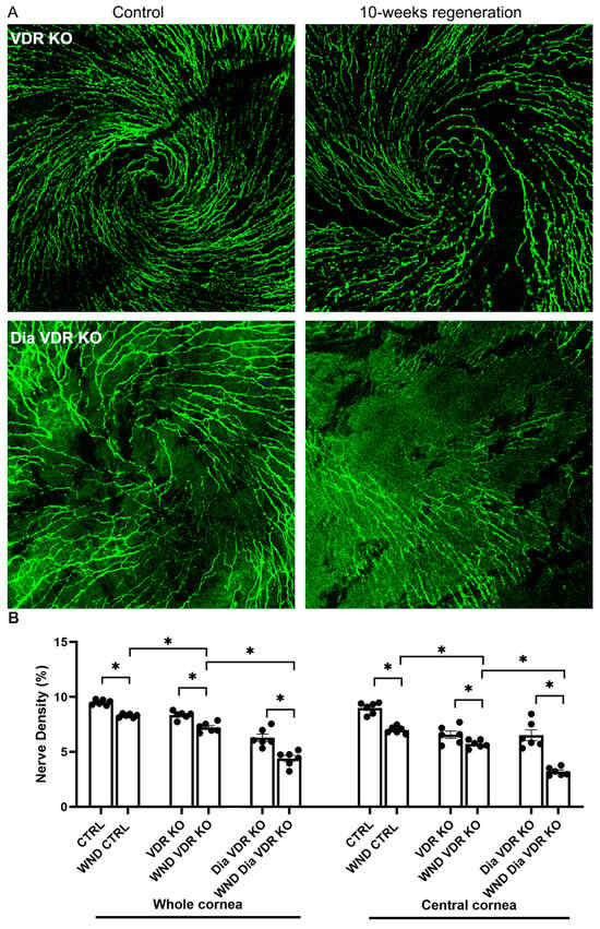 Corneas were wounded in the Dia VDR KO mice, which were then fed a supplemental diet enriched in Ca++ to determine if reductions in serum Ca++ brought on by VDR KO is linked to changes in nerve regeneration. The whole cornea nerve density was increased in diabetic VDR KO mice fed the supplemental diet for 10 weeks after wounding, although not to unwounded levels (Figure 4A,B). Interestingly, unlike the Dia VDR KO mice fed the routine diet, the sub-basal nerve whorl-like pattern was partially restored in the wounded diabetic VDR KO mice fed the supplemental diet (Figure 4A compared to Figure 3A (bottom right)).