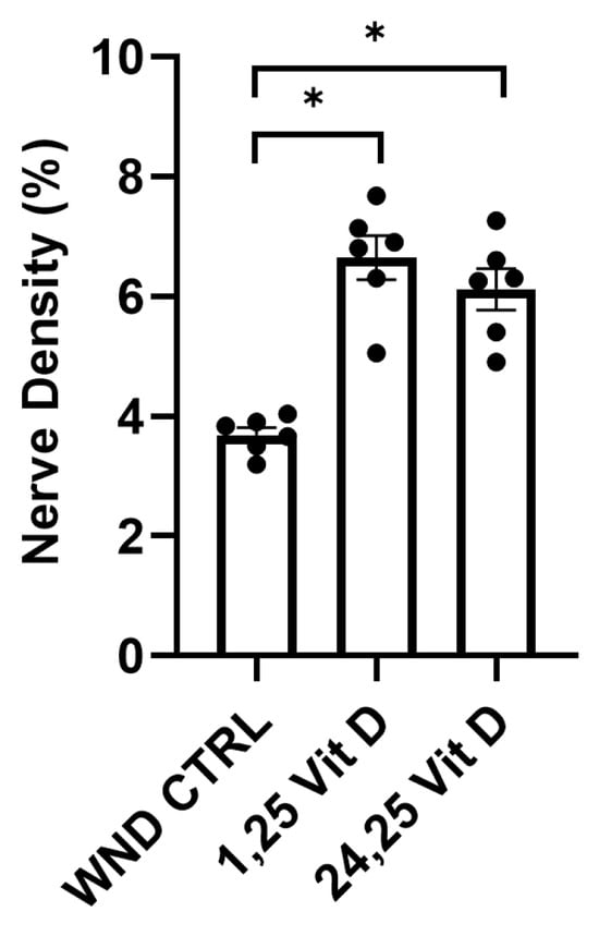 The wounded mouse corneas were treated with 1,25 Vit D or 24,25 Vit D drops 3 times daily for 4 weeks following epithelial abrasion. Whole cornea sub-basal nerve density was significantly higher in the 1,25 Vit D and 24,25 Vit D-treated mice vs. the WND CTRL mice (6.6 ± 0.89% vs. 6.1 ± 0.84% vs. 3.7 ± 0.31%, respectively) (Figure 5).