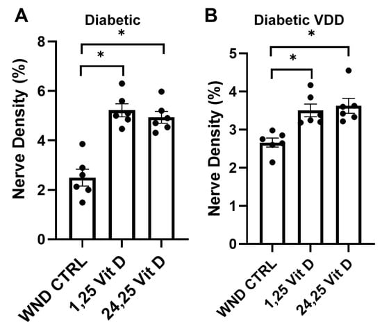 Topical 1,25 Vit D application significantly enhanced whole-cornea sub-basal reinnervation in the WND Dia and WND Dia VDD mice compared to the untreated WND Dia and WND Dia VDD mice (5.2 ± 0.64% vs. 2.5 ± 0.82% and 3.5 ± 0.4% vs. 2.6 ± 0.28%, respectively) (Figure 6). Topical 24,25 Vit D application also significantly increased reinnervation in the WND Dia and WND Dia VDD mice (4.9 ± 0.59% vs. 2.5 ± 0.82%, 3.6 ± 0.48% vs. 2.6 ± 0.28%, respectively) (Figure 6).