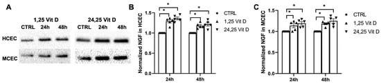 NGF protein expression was increased in the cultured human corneal epithelial cells (HCECs) and the mouse corneal epithelial cells (MCECs) 24 h and 48 h after 1,25 Vit D and 24,25 Vit D exposure (Figure 7; p < 0.05).