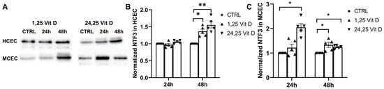 NTF3 protein expression was significantly increased in the HCECs 48 h after 1,25 Vit D and 24,25 Vit D exposure (p < 0.05 and p < 0.01, respectively), but not at 24 h. MCEC NTF3 protein expression was significantly increased 24 h after 24,25 Vit D exposure and 48 h after 1,25 Vit D and 24,25 Vit D exposure (Figure 8; p < 0.05).