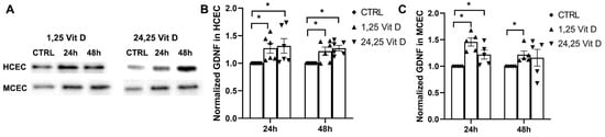 HCEC GDNF protein expression was significantly increased 24 h and 48 h after 1,25 Vit D and 24,25 Vit D exposure. MCEC GDNF protein expression was significantly increased by 1,25 Vit D and 24,25 Vit D after 24 h (p < 0.05), and by 1,25 Vit D after 48 h exposure (Figure 9).