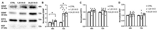 Baseline NGF, NTF3, and GDNF secretion into the medium of the cultured HCECs was observed. GDNF secretion was significantly increased in the HCECs exposed to 24,25 Vit D at 48 and 72 h (Figure 10B) and following 1,25 Vit D exposure at 72 h. NGF and NTF3 secretion was not significantly increased in the HCECs treated with 1,25 Vit D or 24,25 Vit D (Figure 10C,D).