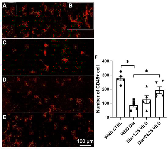 Representative dendritic cells labeling (CD45+) in the basal epithelium of (A) control, (C) diabetic, (D) diabetic plus 1,25 Vit D, (E) diabetic plus 24,25 Vit D corneas, and (F) quantification of cell numbers for each group in (A–E). (B) Magnified image of dendritic-shaped cells from the dashed area in the upper left of (A). The diabetic corneas had fewer dendritic cells than the normoglycemic corneas following cornea abrasion, and topical 24,25 Vit D significantly increased the number of dendritic cells in the diabetic corneas. Individual data points graphed as mean ± SE, n = 5, * p < 0.05.