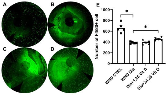 Representative macrophage labeling (F4/80) in the anterior stroma of (A) control, (B) diabetic, (C) diabetic plus 1,25 Vit D, and (D) diabetic plus 24,25 Vit D corneas. (E) The diabetic corneas had fewer macrophages than the normoglycemic corneas following cornea abrasion, and topical 24,25 Vit D significantly increased the number of macrophages in the diabetic corneas. Individual data points graphed as mean ± SE, n = 5, * p < 0.05.