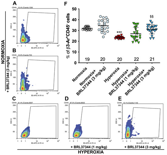 Effect of hyperoxia on β3-AR expressing cells. (A–E) Flow cytometric plot showing colonic cells expressing β3-AR (β3-AR+ CD45− cells). (F) Analysis of the cytofluorimetric plots. Hyperoxia exposure significantly reduced the number of resident colonic cells expressing β3-AR, while treatment with BRL37344 at 3 mg/kg, but not at 1 mg/kg significantly prevented this alteration. No differences were found in the rats treated or not with the β3-AR agonist in normoxic conditions. Values are expressed as mean ± S.D. *** p < 0.001 hyperoxia versus normoxia; §§ p < 0.01 hyperoxia + BRL37344 (3 mg/kg) versus hyperoxia.