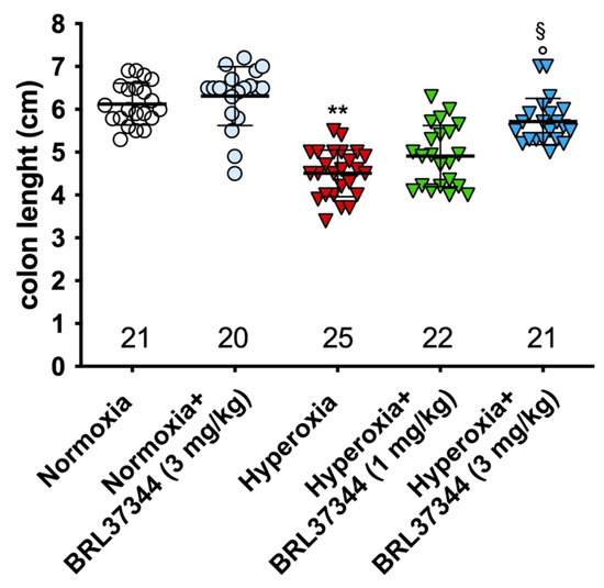 Effect of hyperoxia on colon length. Hyperoxia exposure significantly reduced the colon length of pups and treatment with BRL37344 at 3 mg/kg significantly prevented this alteration. Values are expressed as mean ± S.D. ** p < 0.01 hyperoxia versus normoxia; § p < 0.05 hyperoxia + BRL37344 (3 mg/kg) versus hyperoxia; ° p < 0.05 hyperoxia + BRL37344 (3 mg/kg) versus normoxia.