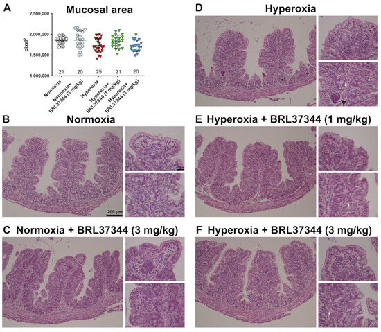 The effect of hyperoxia exposure on proximal colon morphology was also evaluated using morphometrical analysis. Mucosal area quantification performed on H/E-stained sections revealed no statistically significant differences between the experimental groups (Figure 3, panel A). Qualitative evaluations of the proximal colonic mucosa showed typically folded villi and an almost continuous lining epithelium in the rats from all the experimental groups (Figure 3, panels B–F). Minor signs of damage, namely hyperchromatic, putatively apoptotic cells in scattered colonic gland endings, were only detected in the hyperoxia-exposed control rats (Figure 3, panel D) [24]. As shown in Figure 3 (panels D–F), infiltrating mixed leukocytes were present in the colonic mucosa of all the hyperoxia-exposed rats, regardless of the treatment with BRL37344.