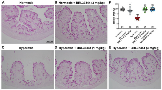The effect of hyperoxia on mucin expression was then evaluated by a quantitative analysis of PAS-stained colon sections [25]. As reported in Figure 4, hyperoxia induced a statistically significant loss of the PAS+ relative area of goblet cells, suggesting reduced mucin production [24]. The administration of BRL37344 at both 1 mg/kg and 3 mg/kg to the hyperoxia-exposed pups was able to restore the PAS+ mucin tissue area to the levels of the normoxic pups (Figure 4, panels A, D, E, F). In contrast, its administration under normoxia did not influence the PAS+ mucin relative area (Figure 4, panels A, B, F).