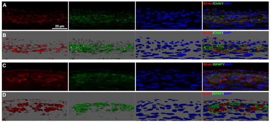 We then sought to identify the myenteric plexus cell types expressing β3-AR. As previously reported [20,26], the presence of this receptor was confirmed on ChAT+ cholinergic neurons (Figure 5, panels A and B), whereas no GFAP-positive glial cells were found to express β3-AR (Figure 5, panels C and D). This finding prompted us to focus on neuronal rather than glial alterations.