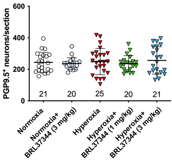 The impact of hyperoxia on the myenteric neuronal population in the proximal colon was first assessed by counting neuronal cell bodies expressing the pan-neuronal marker PGP9.5. No statistically significant differences were found in the total number of neurons between the experimental groups (Figure 6).