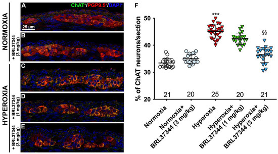 ChAT and PGP9.5 double immunolabelling in the myenteric ganglia. (A–E) Representative images of ChAT+ (green) and PGP9.5+ (red) neurons. Nuclei are counterstained blue with DAPI. (F) Analysis of ChAT/PGP9.5 percentage: compared with pups reared to normoxia, a statistically significant increase in ChAT+ neurons was detected in the control hyperoxia-exposed pups. Treatment with BRL37344 at 3 mg/kg completely prevented this alteration, whereas it was only partially effective at 1 mg/kg. No differences were found in the rats treated with the β3-AR agonist and untreated rats under normoxic conditions. Values are expressed as mean ± S.D. *** p < 0.001 hyperoxia versus normoxia; §§ p < 0.01 hyperoxia + BRL37344 (3 mg/kg) versus hyperoxia. Scale bar = 25 µm.