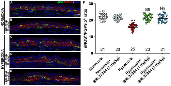 nNOS and PGP9.5 double immunolabelling in the myenteric ganglia. (A–E) Representative images of nNOS+ (green) and PGP9.5+ (red) neurons. Nuclei are counterstained blue with DAPI. (F) Analysis of nNOS/PGP9.5 percentage: compared with pups reared to normoxia, a statistically significant decrease in nNOS+ neurons was detected in the control hyperoxia-exposed pups. Treatment with BRL37344 at both doses prevented this alteration. No differences were found in the rats treated or not with the β3-AR agonist in normoxic conditions. Values are expressed as mean ± S.D. *** p < 0.001 hyperoxia versus normoxia; §§§ p < 0.001 hyperoxia + BRL37344 (1 mg/kg) or hyperoxia + BRL37344 (3 mg/kg) versus hyperoxia. Scale bar = 25 µm.