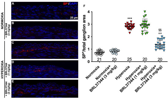 SP immunolabelling in myenteric ganglia. (A–E) Representative images of SP expression (red). Nuclei are counterstained blue with DAPI. (F) Morphometric analysis of SP-positive area per ganglion. Compared with normoxic control rats, those exposed to hyperoxia significantly increased SP+ nerve fibers. Treatment with BRL37344 at 3 mg/kg, but not at 1 mg/kg, exerted a partially protective effect. Values are expressed as mean ± S.D. *** p < 0.001 hyperoxia versus normoxia; §§ p < 0.01 hyperoxia + BRL37344 (3 mg/kg) versus hyperoxia; °° p < 0.01 hyperoxia + BRL37344 (3 mg/kg) versus normoxia. Scale bar = 25 µm.
