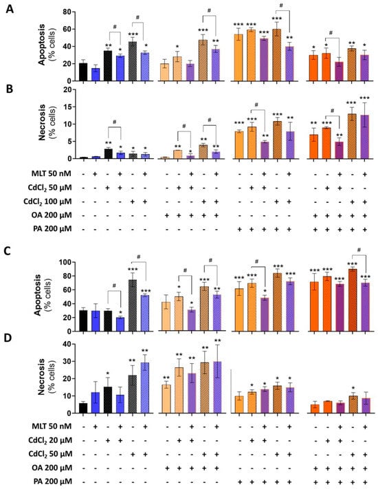 3.3. Cell Death Levels in Cd- and FFA-Induced Lipotoxicity, and MLT Cytoprotective Effect