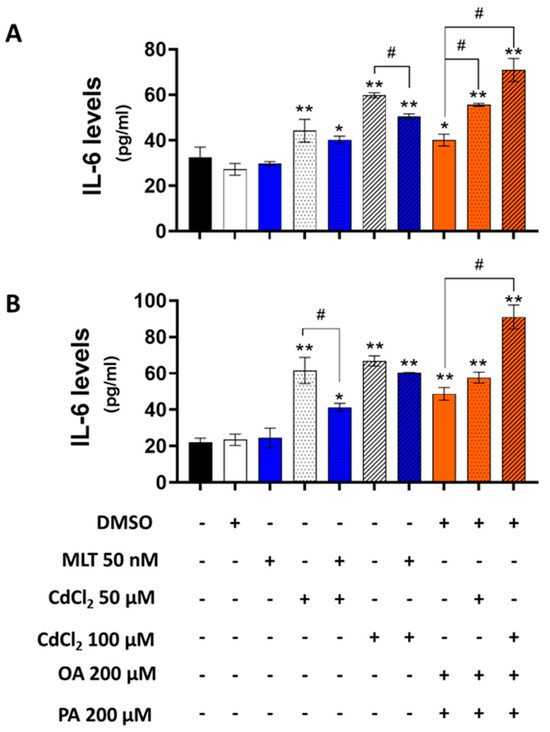 3.5. Effect of CdCl2 and MLT on IL-6 Secretion Levels of HepaRG Cells and Primary Murine Hepatocytes