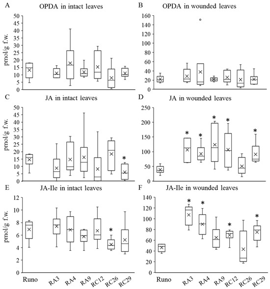 The content of jasmonates ((A,B) OPDA; (C,D) JA; and (E,F) JA-Ile) in intact (A,C,E) and wounded (B,D,F) leaf tissues of non-transgenic emmer wheat (Runo) and transgenic plants with AtAOS (RA3, RA4, and RA9) and AtOPR3 (RC12, RC26, and RC29) gene overexpression. Each box represents data from six biological replicates with whiskers extended to the extreme data points; the midline is the median, the cross is the mean, and the dots are outliers. Stars indicate a statistically significant difference from the non-transgenic control at p ≤ 0.05, as assessed using Student’s t-test.