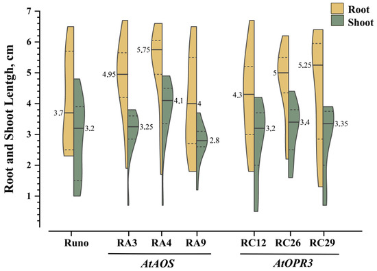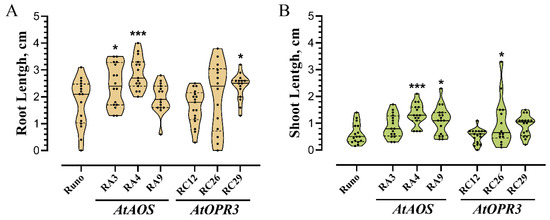 The growth rate of transgenic plant seedlings overexpressing AtAOS (RA3, RA4, and RA9) and AtOPR3 (RC12, RC26, and RC29) and non-transgenic plants (Runo) under osmotic stress conditions. Violin plots display the length of the longest roots (yellow color, (A)) and coleoptiles (green color, (B)) grown in 20% PEG 6000. Each violin represents data from 14–20 seedlings; the solid horizontal lines within the violin show the median values, the dotted lines depict the 75th and 25th percentile of the distribution, and dots are the values of individual measurements. Stars indicate statistically significant difference between genotypes determined via one-way analysis of variance (ANOVA) followed by a Tukey’s post hoc test (*, p ≤ 0.05; ***, p ≤ 0.001).