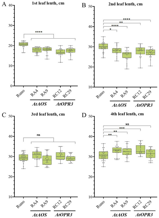 Analysis of leaf length of non-transgenic emmer wheat (Runo) and transgenic plants with AtAOS (RA4 and RA9) and AtOPR3 (RC12 and RC29) gene overexpression. The lengths of 1st (A), 2nd (B), 3rd (C), and 4th (D) leaves were measured; values represent averages of 22–24 plants (transgenic lines) or 38 plants (non-transgenic (Runo)). Stars indicate statistically significant differences calculated according Dunnett’s multiple comparison test: (“*”, p < 0.05), (“**”, p < 0.01), (“***”, p < 0.005), and (“****”, p < 0.001), (ns, non-significant).