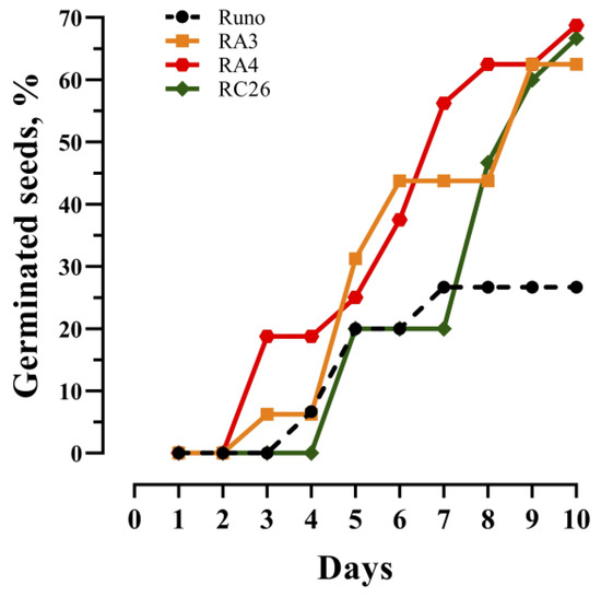 The seed germination rate was recorded in dynamics for fresh seeds of non-transgenic and transgenic lines, which demonstrated the highest percentage of germination under osmotic stress conditions, RA3, RA4, and RC26 (see Table 1) (Figure 6). Observations showed that the difference in germination rate under osmotic stress between non-transgenic seeds and transgenic AtAOS-overexpressing seeds becomes noticeable earlier, especially for line RA4, while the difference between the non-transgenic and AtOPR-overexpressing RC26 seeds is evident only 8 days after soaking.