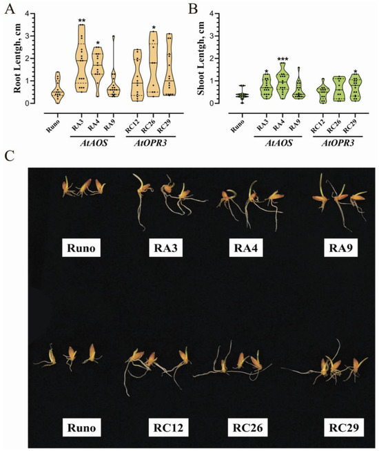 The growth of seedlings germinated from aged seeds of transgenic plants overexpressing AtAOS (RA3, RA4, and RA9) and AtOPR3 (RC12, RC26, and RC29) and non-transgenic plants Runo under osmotic stress conditions. Violin plots display the length of the longest roots (yellow color, (A)) and coleoptiles (green color, (B)) grown after 21 days of incubation in 25% PEG 6000 followed by the 4 days of incubation after dilution the PEG solution with water. Each violin represents data from 17–25 seedlings; the solid horizontal lines within the violin show the median values, the dotted lines depict the 75th and 25th percentile of the distribution, and dots are the values of individual measurements. Stars indicate statistically significant differences between genotypes determined in one-way analysis of variance (ANOVA) followed by a Tukey’s post hoc test (“*”, p ≤ 0.05; “**”, p ≤ 0.01; “***”, p ≤ 0.001). (C) Representative images of seedlings after the stress treatment.