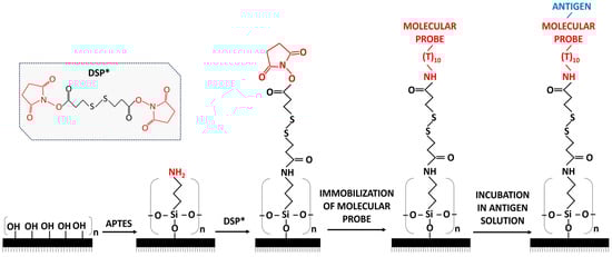 Selection of aptamers for use as molecular probes is performed in two ways: the use of commercial aptamers and the selection of aptamer sequences from literature sources and their further synthesis. The most well-known companies producing aptamers are BasePair (Pearland, TX, USA), APTAMERLAB (Krasnoyarsk, Russia), and APTAGEN (Jacobus, PA, USA). An aptamer sequence is a company’s intellectual property, therefore, it is not always possible to make changes to the so-called linker that is required for covalent surface immobilization of the aptamer. Previously, we demonstrated the opportunity of using AFM chips with immobilized aptamers for biospecific fishing―selective binding of target protein molecules, which are present in the bulk of the test solution, to a small, specifically modified and sensitized surface. For example, this technique has been shown to be effective in detecting HCVcoreAg and Gp120 [,]. Surface sensitization refers to the immobilization of a probe for a target protein on the surface, which is a technique widely used in bioanalysis to ensure the specificity of protein detection. AFM analysis uses the scheme shown in Figure 1. To ensure covalent binding of aptamers, the surface of aminosilanized mica is modified with a dithiobis (succinimidyl propionate) (DSP) cross-linker specific to primary amino groups (Figure 1). This surface modification enables covalent immobilization of an aptamer that has a linker with a terminal amino group.
