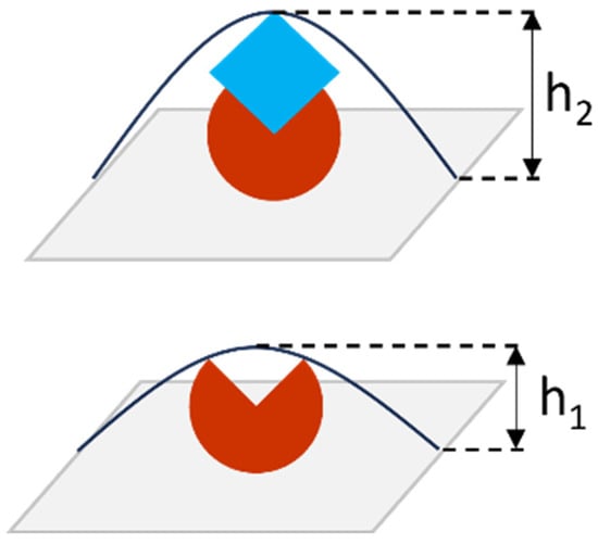 Schematic representation of protein complex formation on the surface: the red object is an immobilized molecular probe with height h1; the blue object is a target protein (antigen); a probe–protein complex with height h2 is formed on the surface during biospecific fishing. Antibodies, aptamers, and peptides can be used as the molecular probe. The height of objects is determined by AFM measurements―scanning of the surface and analysis of its topography.