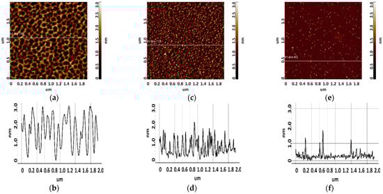 To determine the height of aptamers, they were sorbed onto freshly cleaved mica from 10 μM, 1 μM, and 0.1 μM aptamer solutions. Different solution concentrations were used to increase the reliability of data and evaluate the contribution of an aggregated state of molecules to the results of AFM imaging. The control in this series of experiments included AFM imaging of the surface after incubation of freshly cleaved mica in a MgCl2 solution. The visualization results are shown in Figure 4. As can be seen in Figure 4, no objects with a height of more than 0.5 nm were detected on the surface.