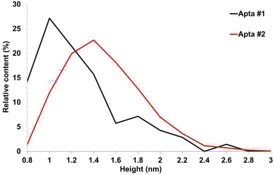 Upon sorption of aptamers from a 0.1 μM solution, a fewer objects were visualized on the surface. The AFM imaging results were statistically processed, and Figure 7 shows the relative distribution of visualized objects by height. As seen from Figure 7, the height of visualized objects was 1.0 ± 0.2 nm in the case of apta#1, but there were also objects with a height of 1.8 ± 0.2 nm. In the case of apta#2, the height of visualized objects was 1.4 ± 0.6 nm. Objects of more than 1 nm in height indicated the presence of aggregated structures, along with the monomeric form, in aptamer solutions. Thus, in the case of apta#2, AFM data indicated the presence of molecular aggregates in the solution even at the lowest concentration of 1 μM that were sorbed on the surface. These results suggested the aggregation of aptamer molecules in highly concentrated solutions. All objects visualized on the surface were attributed to aptamer molecules because no objects were detected in control experiments (visualization of the surface after incubation in a MgCl2 solution free of aptamer molecules) (Figure 4).