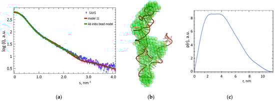 For the apta#1 model with the lowest χ2 value, plots with the best fits to the experimental SAXS data (Figure 8a) and three-dimensional visualization by overlaying (Supcomb from ATSAS 3.0.4 []) the molecular model with the ab initio three-dimensional shape of apta#1 reconstructed from SAXS data (Figure 8b) demonstrating good agreement between the models are presented.