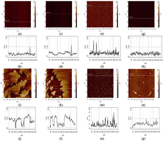 Detection of CA125 (1 nM solution) using chips with immobilized aptamers. Typical AFM images after immobilization of aptamers (a,c,e,g) and after incubation in a test antigen solution (i,k,m,o). The chip comprised immobilized apta#1 (a,i), apta#2 (c,k), apta#3 (e,m), and an aptamer-free control area outside the sensing zone (g,o). Sections (b,d,f,h,j,l,n,p) correspond to the lines in images (a,c,e,g,i,k,m,o).
