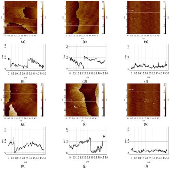 Visualization of the surface after CA125 biospecific fishing is presented in Figure 9i,k,m and Figure 10a,c,e,g,i,k. As seen from the figures, in all cases of chips with immobilized apta#1 and apta#2, there were layered objects with a height of 1 to 1.5 nm that were present on the surface after incubation in the antigen solution with concentrations of 1 nM (Figure 9i,k), 0.1 nM (Figure 10a,c), or 0.01 nM (Figure 10g,i). In the case of apta#3, only the solution with the highest antigen concentration of 1 nM was analyzed; after incubation with the solution, compact objects of up to 6 to 7 nm in height were visualized on the surface. In all control experiments, neither layered nor compact objects were detected on the aptamer-free surface (Figure 9o and Figure 10e,k). Therefore, all objects visualized on the aptamer-immobilized surface after incubation in test CA125 solutions of various concentrations may be attributed to target protein molecules. In all cases, the protein was successfully detected using chips with immobilized aptamers because aptamer–protein complexes were visualized on the surface.