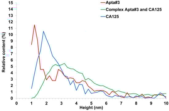 Relative distribution (A) of visualized objects on an AFM chip surface after immobilization of apta#3 (red line); after apta#3–antigen complex formation (green line); after sorption of the CA125 antigen onto the surface of freshly cleaved mica (blue line).