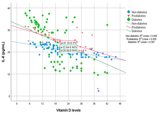 In a cross-sectional study conducted by Zhang et al., 199 prediabetes patients were compared with 259 normal patients. The CRP levels were higher in the prediabetes group with Vit D deficiency and insufficiency, but no statistically significant differences were found between the IL-6 and TNF-α values [1]. In our study, the TNF-α and IL-6 levels in both the preDM and DM groups were found to be statistically significantly higher in patients with Vit D deficiency and insufficiency compared to normal ones (Table 3 and Table 4). The CRP levels were significantly higher in the preDM and DM groups compared to the nonDM group (Table 1).