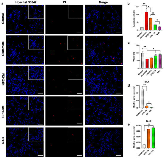 Figure 2. CM improve cell viability and reduce apoptosis in a model of oxidative stress induced by 30 mM glutamate for 24 h (cultured under standard conditions: 5% CO2 and 37 °C). Analysis of the number of apoptotic and necrotic cells, using Hoechst 33342 and propidium iodide staining in the glutamate toxicity model on the PC12 cell line: fluorescence microscopy (a), count of apoptotic cells (b). Assessment of relative cell viability using MTT assay (c). Relative expression of the BAX gene (pro-apoptotic marker) (d), and Bcl2 gene (anti-apoptotic marker) (e). Scale bar, 100 µm. * = p < 0.05, ** = p < 0.01.