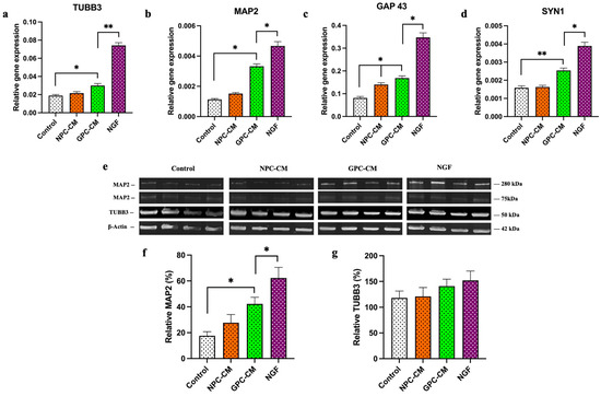 Figure 5. Neurotrophic effects of NPC-CM and GPC-CM assessed by qPCR and Western blot analysis. Relative expression of the TUBB3 gene (a), MAP2 (b) (neuronal differentiation marker), GAP43 gene (c) and SYN1 genes (d) (neurite outgrowth marker). Representative blots (e); relative protein level of the MAP2 (f), TUBB3 (g). * = p < 0.05, ** = p < 0.01. Original western blotting figures can be found in Supplementary Materials.