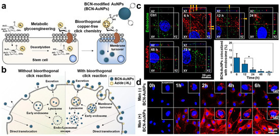 In the meantime, S. Lim et al. proposed a novel approach to increase the efficiency of nanoparticle-based stem cell labeling and improve the label duration through the application of metabolic glycoengineering and bioorthogonal click chemistry [92]. For the cell labeling, bicyclo[6.1.0]nonyne (BCN)-modified and Cyanine 5.5 (Cy5.5) dye-conjugated glycol chitosan nanoparticles (BCN-CNP-Cy5.5s) and three different azide-containing metabolic precursors were separately prepared. hMSCs were previously incubated with azide-containing precursors to induce azide expression on the plasma membranes, and BCN-CNP-Cy5.5s were subsequently treated with hMSCs for labeling via a copper-free click reaction between the BCN and azide. Comparing the azide expression efficiency of hMSCs after incubating with three precursors, respectively, hMSCs incubated with tetraacetylated N-azidoacetyl-D-mannosamine (Ac4Man-NAz) showed the highest azide expression level on their membrane. hMSCs were successfully labeled with BCN-CNP-Cy5.5s upon the preceding Ac4Man-NAz incubation, showing higher labeling efficiency and longer labeling preservation compared to those without Ac4Man-NAz incubation or BCN-Cy5.5 labeling. Importantly, the hMSCs labeled with both Ac4Man-NAz and BCN-CNP-Cy5.5 were detected at their injected sites over 15 days through in vivo fluorescence imaging, whereas those labeled with BCN-CNP-Cy5.5s were not visible after 5 days post-injection. In another study by the same research group, BCN- and Cy5.5-conjugated gold nanoparticles (BCN-AuNP-Cy5.5s) and Ac4Man-NAz were also evaluated for fluorescence labeling of hMSCs (Figure 2a) [49]. Interestingly, it was observed that BCN-AuNP-Cy5.5s labeled on hMSCs via glycoengineering-assisted bioorthogonal click chemistry were not only located on the cell membranes but also visible inside the cells, which was considered to extend the label persistence. The specific endocytosis mechanism of ectocellularly labeled BCN-AuNP-Cy5.5s was discovered, wherein the multivalent binding of BCN-AuNP-Cy5.5s to azides on the membrane caused the membrane turnover to internalize BCN-AuNP-Cy5.5s via endosome formation (Figure 2b) [93]. Endosome-mediately endocytosed BCN-AuNP-Cy5.5s underwent endosomal escape, and eventually, a large amount of them was localized in the cytosol (Figure 2c). The gradual endocytosis of bioorthogonally labeled BCN-AuNP-Cy5.5s over time was detected through in vitro fluorescence imaging, resulting in a 3.0-fold stronger intracellular fluorescence intensity compared to that without the preceding Ac4Man-NAz treatment after 6 h post-incubation (Figure 2d). The labeling efficiency of BCN-AuNP-Cy5.5 with Ac4Man-NAz was also higher than that of small-molecule dye-based bioorthogonal labeling since small molecular dyes cannot be internalized into cells via multivalent binding and membrane turnover. The results of two series of studies indicated that metabolic glycoengineering and click chemistry-based cell labeling are powerful methods to enhance labeling efficiency in stem cell imaging.