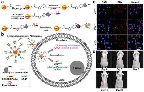 Similar to fluorescent dye-embedded nanoparticles, it is important to enhance the endocytosis and extend the intracellular retention of QDs for efficient in vivo stem cell tracking. Y. Lei et al. fabricated Tat peptide-conjugated QDs (QD-Tat peptides) for the sufficient labeling of MSCs [100]. QD-Tat peptides were produced by coating CdSe/ZnS QDs with DSPE-PEG 2000 amine and conjugating cysteine-modified Tat peptide to the end of the PEG chain. QD-Tat peptides were actively taken up by MSCs and localized within perinuclear spaces, while QDs without Tat peptide conjugation showed no significant cellular internalization. The endocytosis efficiency of QD-Tat peptides was over 95%, which promoted the tracking of QD-Tat peptide-labeled MSCs via fluorescence microscopy after intravenous administration to mice. Arg-Gly-Asp (RGD) peptides have also been utilized to improve the labeling efficiency of QDs [101]. J. Li et al. synthesized RGD peptide- and β-cyclodextrin (CD)-modified CdTe/ZnS QDs (RGD-β-CD-QDs) and employed them for human MSC (hMSC) labeling (Figure 3a). The surface-conjugated RGD peptides assisted the cellular uptake of RGD-β-CD-QDs by mediating the interaction with RGD receptors, and β-CDs improved the hMSC viability after the labeling (Figure 3b,c). In the in vivo assessment, the long-term tracking of RGD-β-CD-QDs-labeled MSCs after their subcutaneous implantation was accomplished for up to 21 days without significant reduction in fluorescent signals (Figure 3d).
