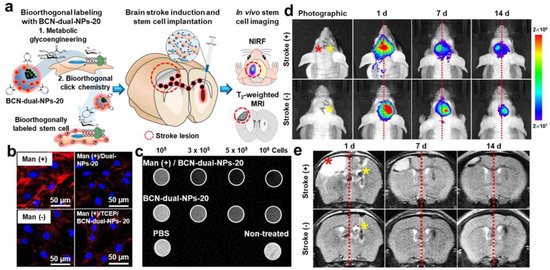 Through the introduction of cell-targeting moieties to fluorescence–MR dual labeling probes, their labeling efficiency can be considerably enhanced. X. Xie et al. developed Tat peptide-conjugated paramagnetic UCNPs as fluorescence–MR dual labeling probes for MSC tracking [185]. NaYF4: 20% Yb, 2% Er, and 30% Mn UCNPs were synthesized through the Turkevich–Frens method, which expressed not only fluorescence signals at the 660 nm wavelength but also T1-weighted MR contrast due to the Mn content. The UCNPs were subsequently surface-modified with Tat peptides to form Pep/UCNPs, and the cell labeling performance of Pep/UCNPs against bone marrow-derived MSCs (BMSCs) was compared to that of silica- or DNA-coated ones (SiO2/UCNPs or DNA/UCNPs). Among three UCNPs with different coatings, Pep/UCNPs were labeled to BMSCs at the most immediate rate and with the greatest amounts while showing the lowest cytotoxicity. Pep/UCNP-labeled BMSCs were intravenously injected into normal mice, whose biodistribution for 24 h was clearly visible via in vivo fluorescence and T1-weighted MR imaging. In another study by S. Lim et al., hMSCs were labeled with fluorescence–MR dual imaging probes through metabolic glycoengineering-involved bioorthogonal chemistry (Figure 6a) [43]. For the preparation of dual imaging probes, SPIONs were encapsulated in BCN-conjugated glycol chitosan nanoparticles, and Cy5.5 dyes were subsequently conjugated onto the nanoparticles to obtain BCN-dual-NPs. hMSCs were successively incubated with Ac4ManNAz and BCN-dual-NPs for labeling, which showed a far higher labeling efficiency of 98.7% than only BCN-dual-NP-treated ones (13.3%) after 6 h incubation (Figure 6b). The T2-weighted MR contrast of Ac4ManNAz/BCN-dual-NP-labeled hMSCs was confirmed through the in vitro phantom test (Figure 6c). When Ac4ManNAz/BCN-dual-NP-labeled hMSCs were implanted into the brain tissues of photothrombotic stroke-induced mice, their gradual migration to the lesional area was detectable through both fluorescence and MR imaging for 14 days, indicating the desirable stem cell labeling ability of BCN-dual-NPs with Ac4ManNAz treatment (Figure 6c,d).