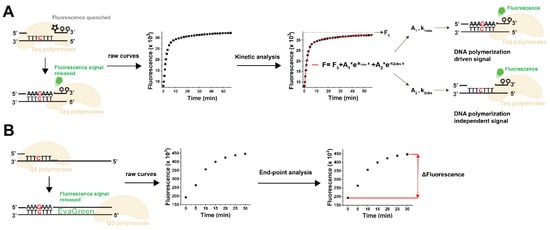 Comparison of the fluorescent dNTP incorporation methods. (A) Scheme of the TaqMan probe-based method using kinetic analysis []. Star represents the FAM fluorophore, while circles represent the quenchers on the probe. The schematic view shows a dGTP measurement; the red C represents the detection site for dGTP. Raw reaction curves are fitted with  equation, where F is the observed fluorescence; x is the variable (time); A1 and A2 are fluorescence amplitudes; k1obs and k2obs are the rate constants of the observable fluorescence phases; and F0 is the y offset. The A1 and k1obs parameters relate to the DNA-polymerization-dependent signal increase, while the A2 and k2obs parameters are related to the DNA-polymerization-independent exonuclease activity of the polymerase. The A1 parameter is proportional to the incorporation of limiting dNTPs and is used for calibration and samples measurement. The kinetic analysis is performed by the dedicated and streamlined NucleoTidy software (http://nucleotidy.enzim.ttk.mta.hu/). (B) Scheme of the method based on the quantitative determination of double-stranded DNA []. The method uses long DNA templates suitable for EvaGreen detection if complemented by the synthesized complimentary strand. The schematic view shows a dGTP measurement; the red C represents the detection site for dGTP. The readout is the total fluorescence signal increase which is proportional to the limiting dNTP incorporated, and, therefore, ΔF is used for calibration and samples measurement.