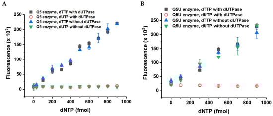 Difference between the Q5 and Q5U enzymes in accepting dUTP as a substrate. (A) The Q5 enzyme does not incorporate dUTP into the DNA; therefore, the presence of dUTPase enzyme does not influence the dTTP measurement. (B) The Q5U enzyme incorporates dUTP into the DNA as efficiently as dTTP against the same template and in the same conditions (green triangles). All data points represent the mean and standard error of two independent experiments with two technical replicates (four measurements in total).