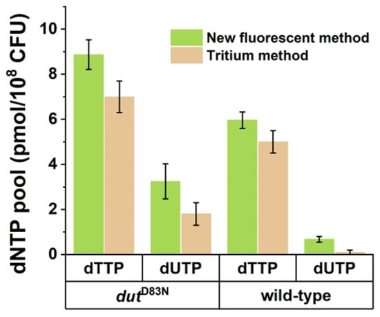 We previously determined the dUTP content of Mycobacterium smegmatis wild-type and dutD83N mutant strains using a radioactive dNTP incorporation measurement method []. To test the performance of the newly developed fluorescent protocol on biological samples, we subjected samples from these two mycobacterial strains to dUTP measurement using the Q5U polymerase. We found that applying our newly established protocol resulted in the same pattern and same dNTP concentrations within the margins of error of the two methods in the measurable range (Figure 3). The observed differences between the fluorescent and radioactive methods were nonsignificant in the paired-sample t-test with the exception of the wild-type dUTP samples. In this case, the dUTP content of the sample was at the lower detection limit of the radioactive assay, with 100% relative error. This makes this result less reliable than the one yielded by our new, fluorescent method. It must be noted that each type of biological sample may need an optimization of the reaction conditions due to the matrix effects experienced using both the Purhonen et al. [] and the Szabó et al. [] methods.