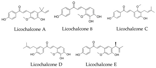 Chemical structural formula of licochalcones A, B, C, D and E.