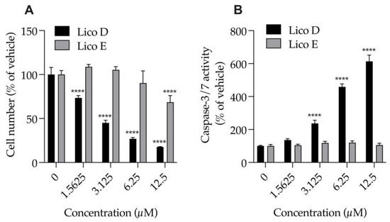 Effect of Licos D and E on the number of cells and caspase-3/7 activity of SIM-A9 cells. (A) The number of viable cells was determined after each separate treatment with Licos D and E (1.5625, 3.125, 6.25 and 12.5 μM) for 24 h. Cell number was calculated using 100% viable cells in the vehicle control group. (B) Caspase-3/7 activity was presented as a percentage of vehicle control. Values are the mean ± SD (n = 4). **** p < 0.0001 compared with vehicle control. Statistical analysis of the data was performed using Tukey’s multiple comparisons test.