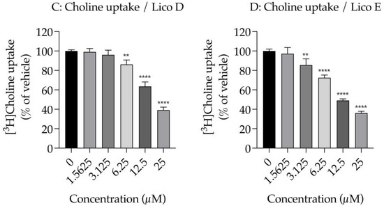 First, we examined the effect of Licos D and E on membrane permeability in SIM-A9 cells. Impaired membrane permeability induces cell death and, consequently, decreased ATP contents are observed. We, therefore, measured ATP contents after treatment with up to 100 µM of Licos D and E for 40 min in SIM-A9 cells. Licos D and E were observed to impair membrane permeability and decrease ATP contents at high concentrations above 25 µM (Figure 4A,B). Based on these results, we investigated the effect of Licos D and E on [3H]choline uptake at concentrations below 25 µM.